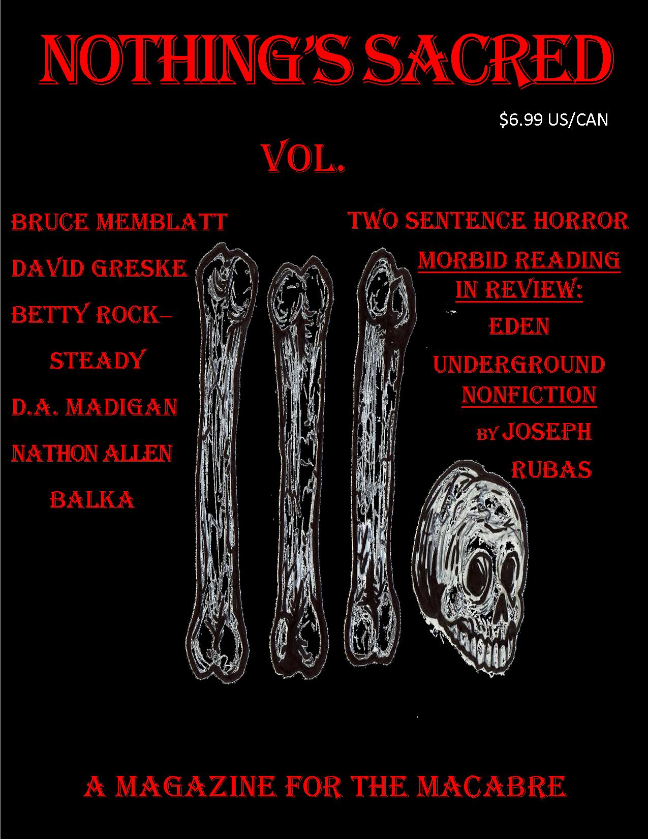 My next short story, “Rough Justice,” will be appearing in Nothing’s Sacred Vol. 3 in about ten days. Nothing’s Sacred Vol. 3 can be found at www.jackofnotradesproductions.com